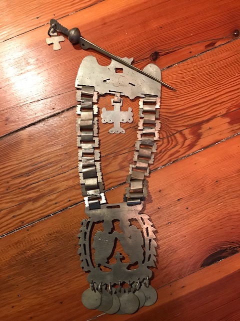 A ceremonial indigenous breastplate, called a síquel, which was gifted by a Mapuche community to the Vicaría de la Solidaridad for their work protecting indigenous people from repression. The Vicaría subsequently presented the síquel to Melissa Moye in 1987, during her visit to Chile, for the work done by Jubilee Crafts to distribute Chilean handcrafts and educate the US public on the arpillera movement and political repression in Chile.