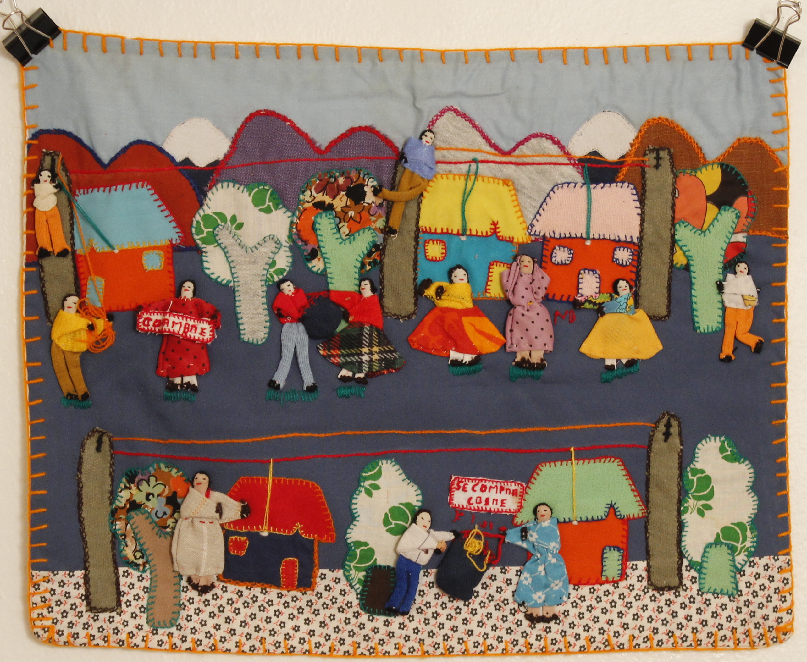 This collection of Chilean arpilleras comes from Jubilee Crafts, a nonprofit women’s collective with origins in 1974 to market international handcrafts at fair prices. During the two decades of its existence, Jubilee Crafts imported and sold these handcrafts from over two dozen cooperatives in sixteen countries. At its peak, Jubilee Crafts distributed 70,000 mail-order catalogs a year. It also established a nationwide network of 100 unpaid volunteers who sold the handcrafts at house parties for neighbors and friends, at holiday craft fairs, and in presentations to church and community groups. From the beginning, education about justice issues was central to their presentations.1